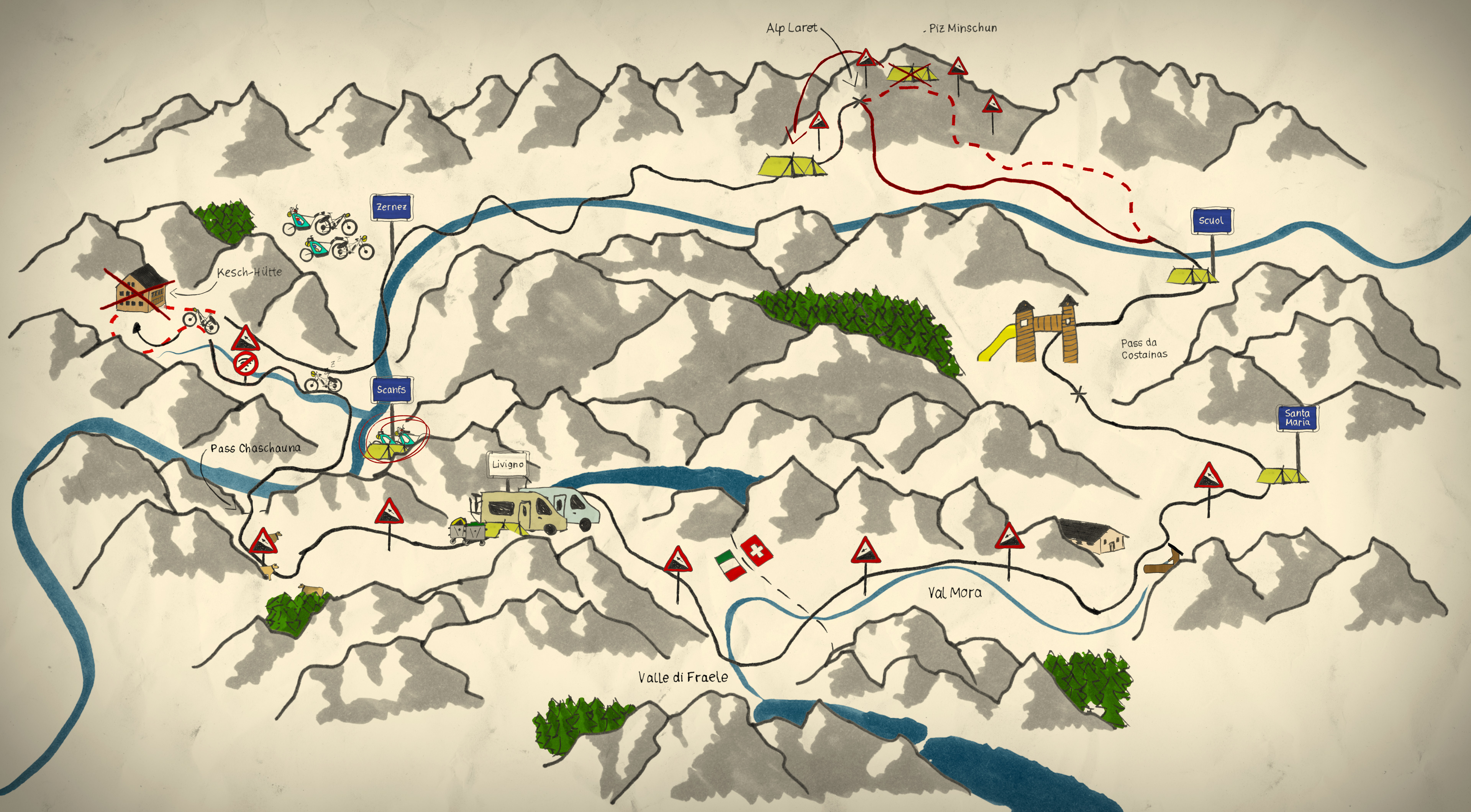 Damit in der Schweiz auch erste Downhill-Erfahrungen gesammelt werden können, haben die Papas sogar die Laufräder mitgenommen. Foto: Holger Wimmer