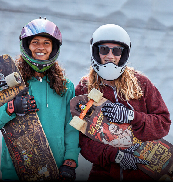 Between walls of snow, Johanna Bolaños Cabrera and Jasmijn Hanegraef take the fastest route from the Timmelsjoch to the valley—via longboard.